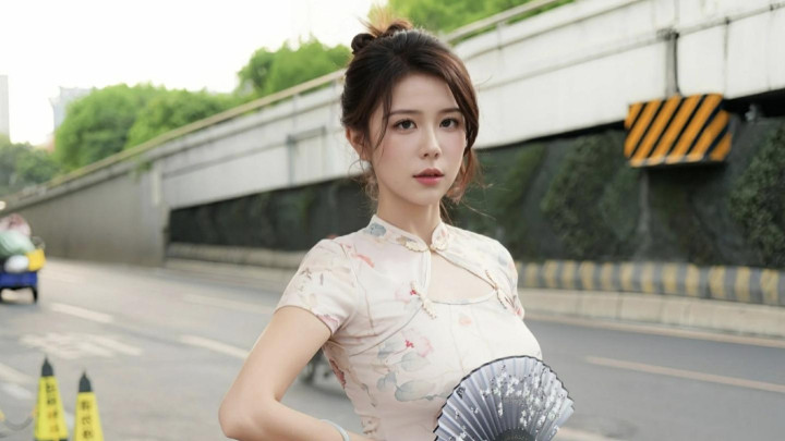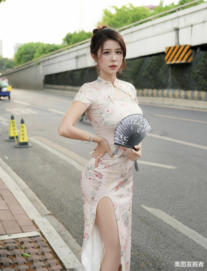 米白旗袍勾勒S曲线,短袖设计秀纤细臂膀,高开叉露出白皙长腿,行走间摇曳生姿。修身包臀凸显腰臀比,搭配尖头高跟鞋拉长腿部线条,手执折扇轻摇,尽显古典妩媚与现代性感交融的纯欲风韵。